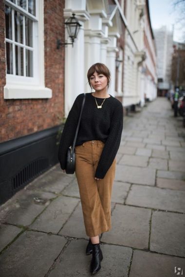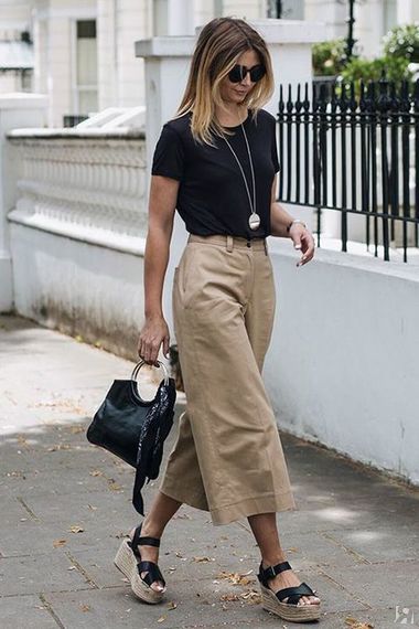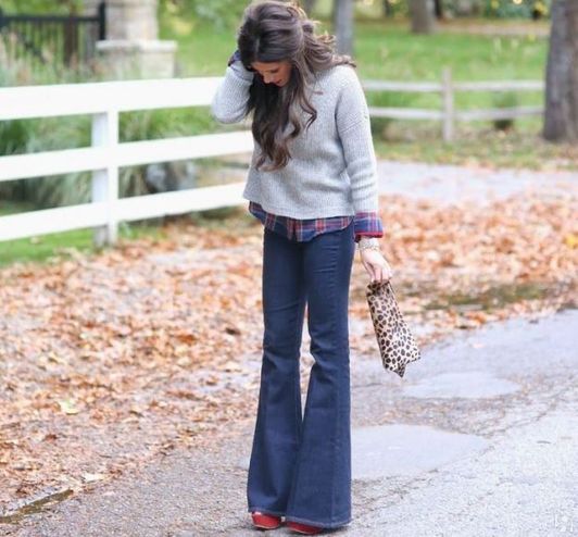 Кюлоты будут идеальны с казаками, высокими сапогами, высокими ботинками, уходящими прямо под штанину (иначе рискуете визуально сократить свой рост). А вот джинсы клеш полной длины прекрасно вытягивают рост.