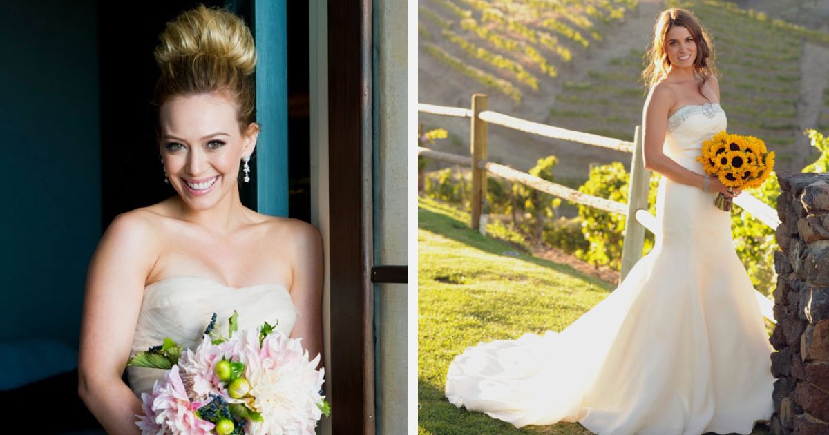 Хилари Дафф стала женой хоккеиста Майка Комри в 2010 году (к сожалению, они уже расстались). Для торжественной церемонии прекрасная невеста выбрала высокий и объемный пучок.