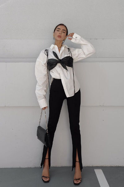 Хотите за пару секунд превратить офисный образ в парадно-выходной? Кроп-топ в помощь! Надевайте его поверх классических или оверсайз рубашек, меняйте лоферы на каблуки — и вуаля! Теперь никто не поймет, что вы отправились в бар сразу после деловой встречи. Если есть желание (и стальной пресс), можете носить укороченный топ под рубашку, не забыв подвернуть рукава.
