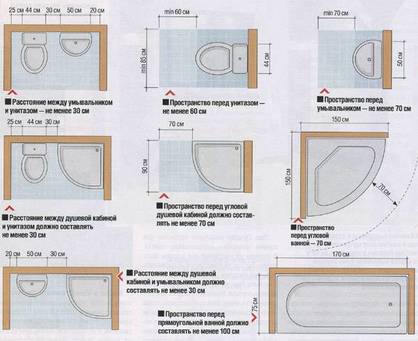 Минимальные расстояния между оборудованием и стенами в ванной комнате определены еще в советских нормативах. Эти данные следует учитывать при проектировании (т. к. в современных документах такой информации нет) и использовать в сторону увеличения — ни в коем случае не уменьшения.