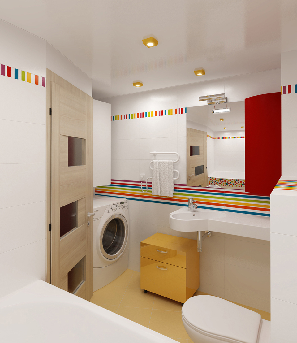 Если вы в дальнейшем планируете рождение ребенка, то стоит заблаговременно задуматься о размещение пеленального столика.Он свободно умещается, если душевую кабину и стиральную машину расположить у левой стены. Когда ребенок подрастет, столик можно с легкостью заменить на шкаф.