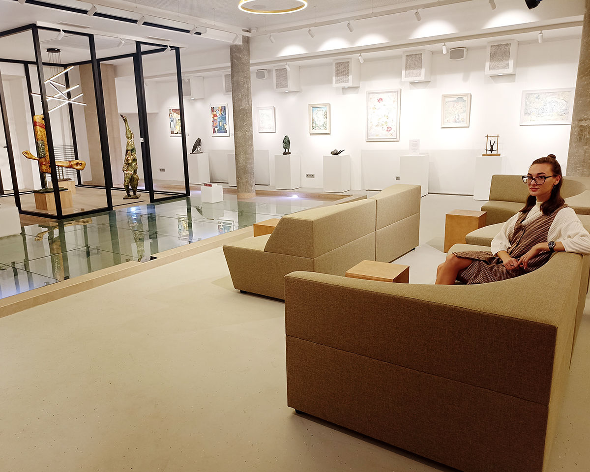 Новая галерея впечатляет не только своими картинами, но и необычайно уютным интерьером. Заходишь в холл — и тебя встречают массивные горшки со степной травой, что придает месту особую атмосферу. А когда спускаешься по лестнице на цокольный этаж, то попадаешь в необычное пространство, центр которого занимают мягкие диванчики и небольшие столики.